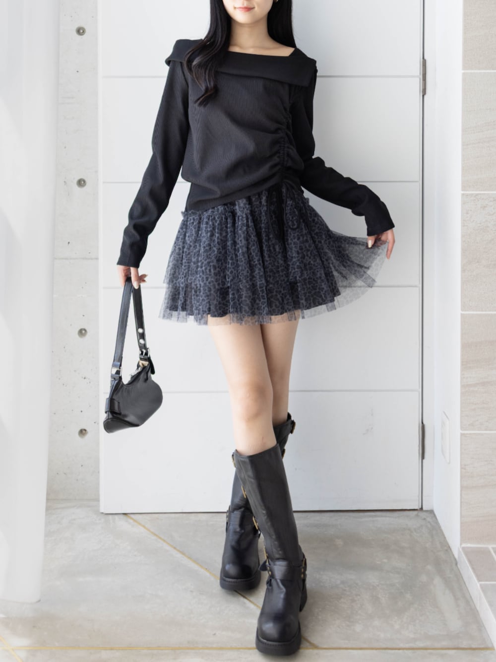 肩見せトップスとチュールスカートの組み合わせで、 甘さと大人っぽさをMIXしました♪ オールブラックでも素材感で軽やかに見せるのがポイントです☆