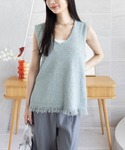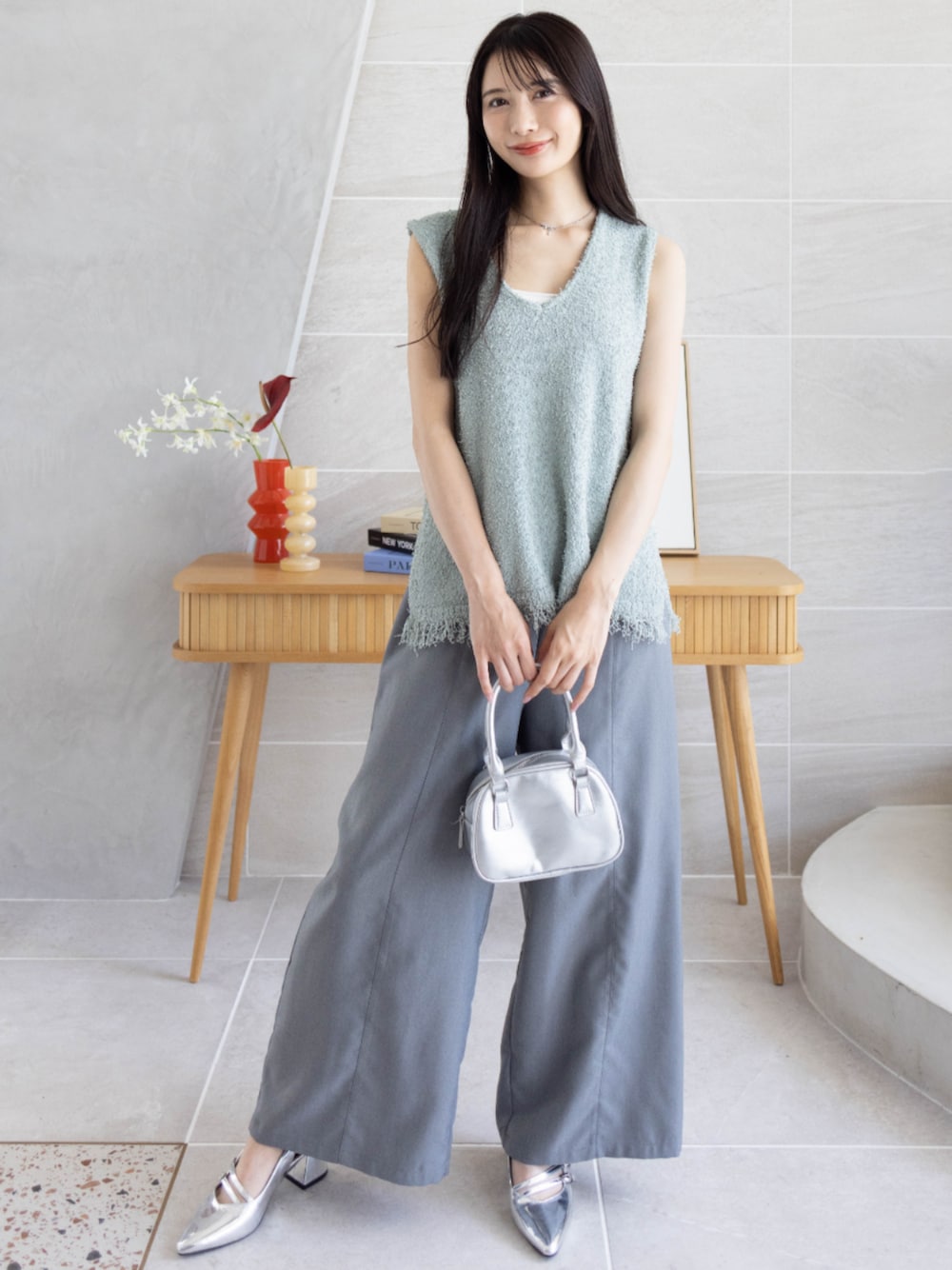 シャリ感のあるミントカラーのニットが、 涼しげな印象を与えてくれます! ワイドパンツとシルバー小物で、 抜け感のある大人カジュアルにまとめました