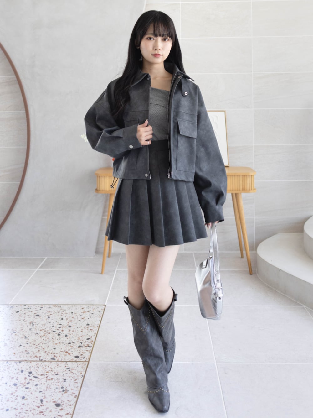 ワントーンでまとめたセットアップ風コーデ フェイクレザーの質感がスタイリッシュで、シルバー小物が洗練された印象を添えています