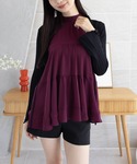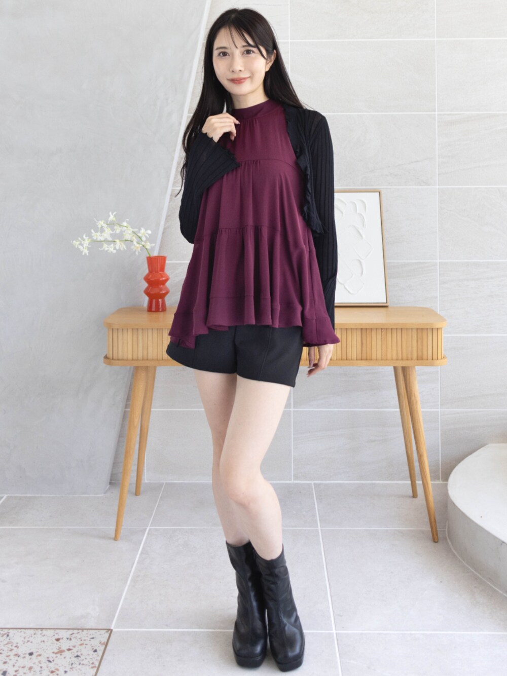 ワインレッドのティアードブラウスが華やかな主役に ブラックのショートパンツとブーツで全体を引き締めた、 大人フェミニンなスタイリングです