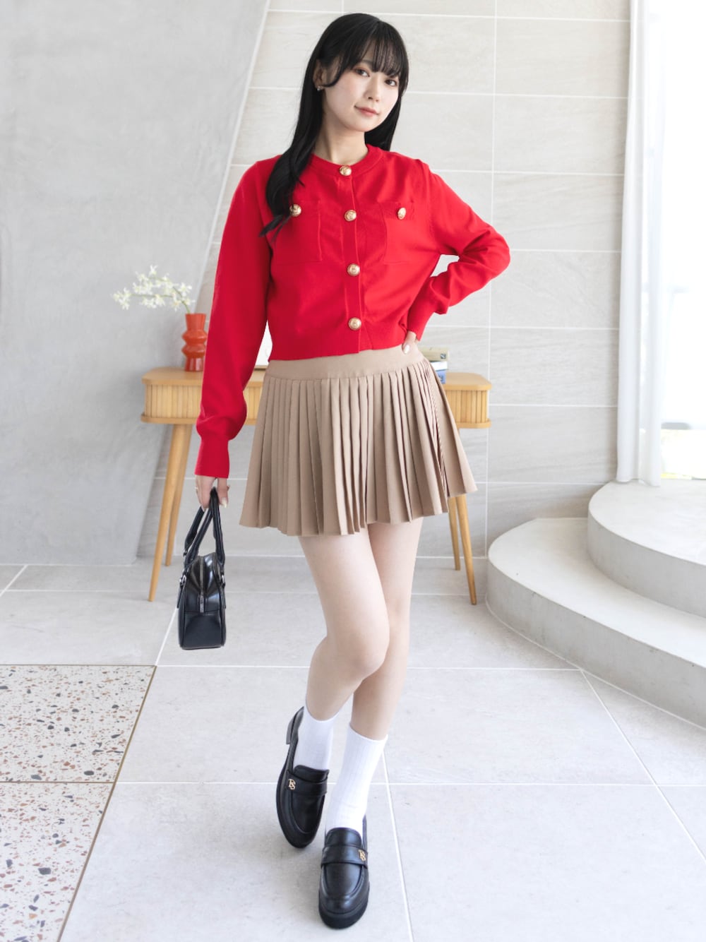 真っ赤なカーデにベージュのプリーツミニで 元気いっぱいスクールガール風コーデが完成!