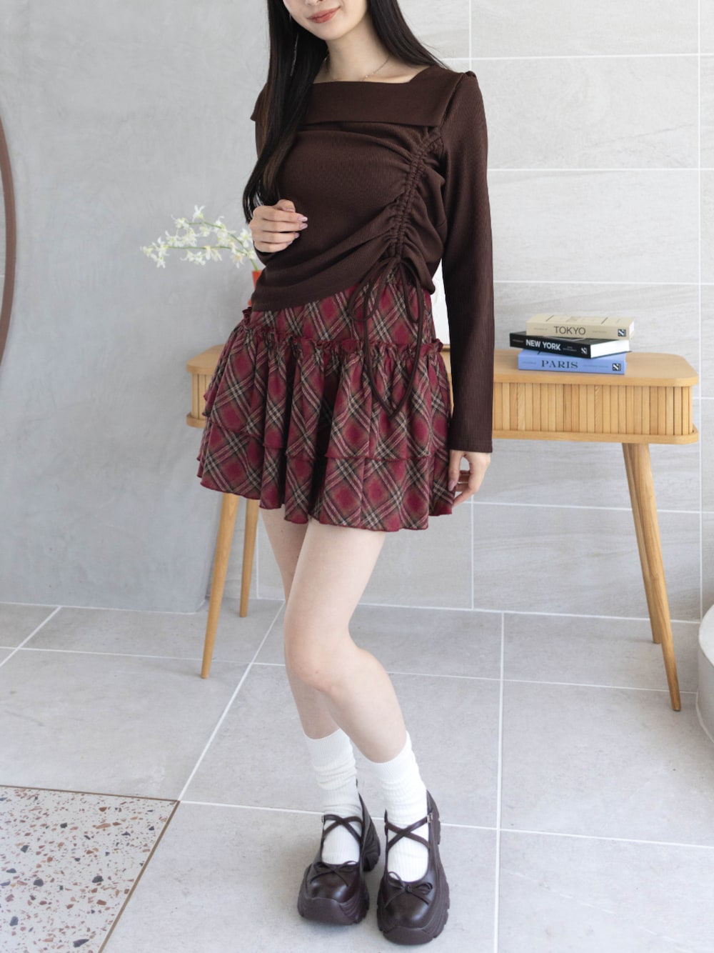 ショコラカラーのトップスに赤チェックのミニスカを合わせて、 甘すぎない秋のガーリースタイルが完成!