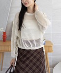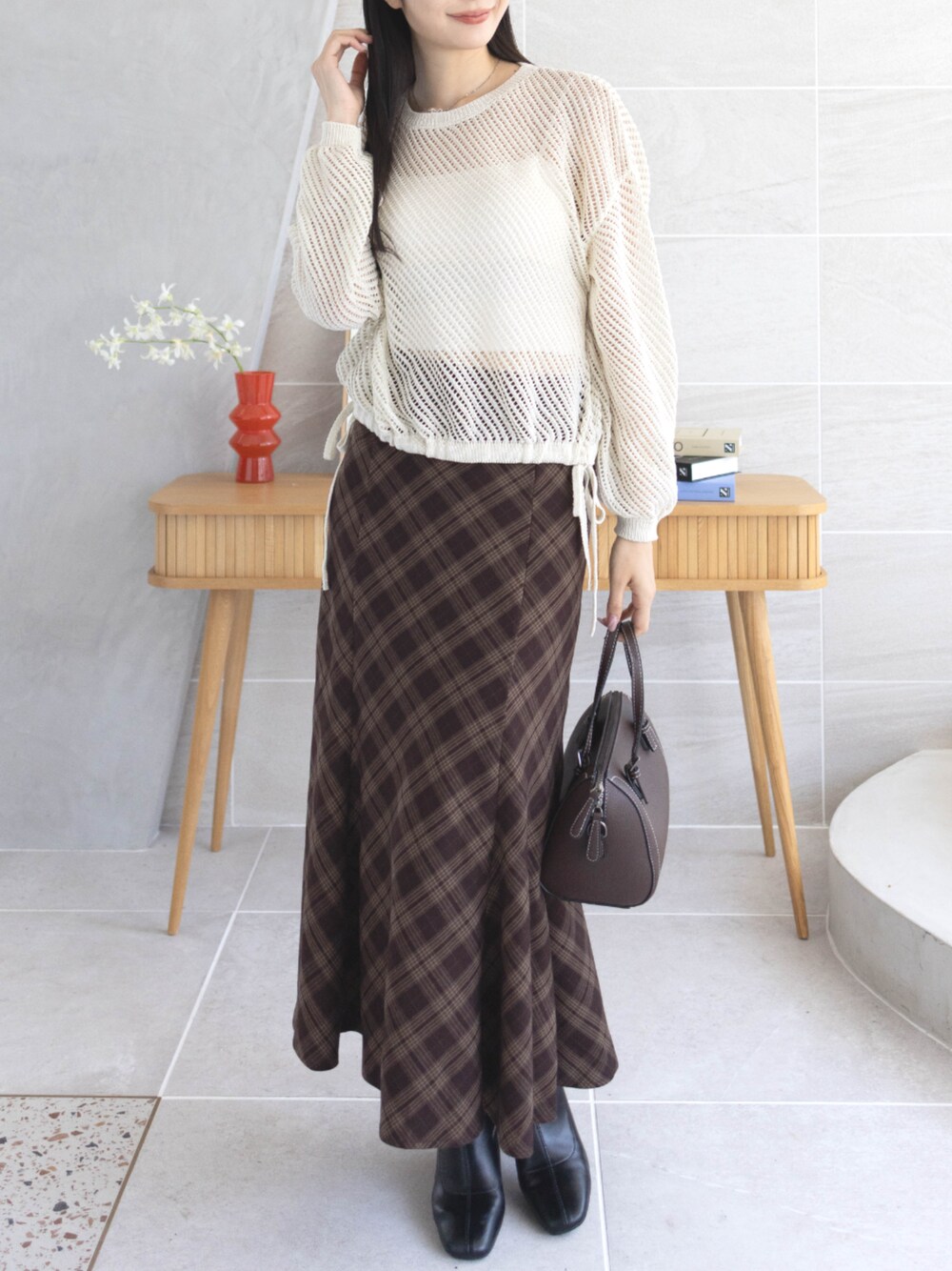 メッシュニットとマーメイドスカートの軽やかコンビで 秋のはじまりをちょっぴり先取りしたカジュアルフェミニンコーデ。