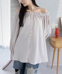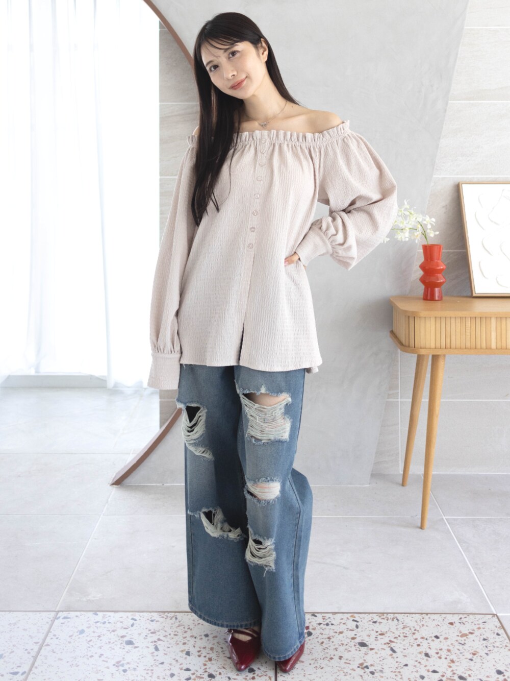 ボリューム袖のオフショルトップスにダメージデニムを合わせて 甘さとカジュアルのバランスがちょうどいいゆるモードコーデに!