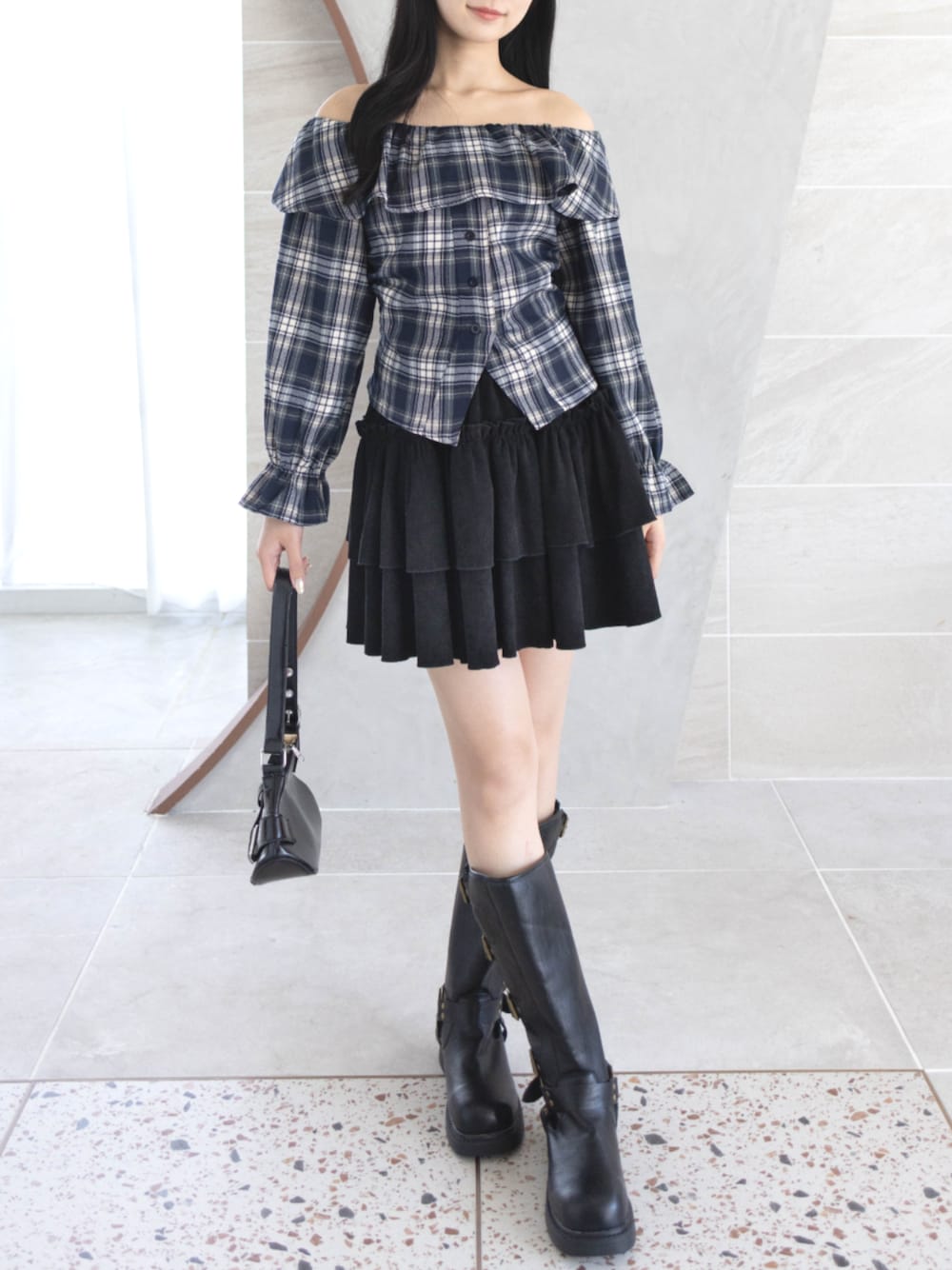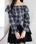 オフショル×チェック柄にブラックのティアードスカートを合わせて 甘さとクールさをバランスよく取り入れたコーデです。