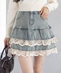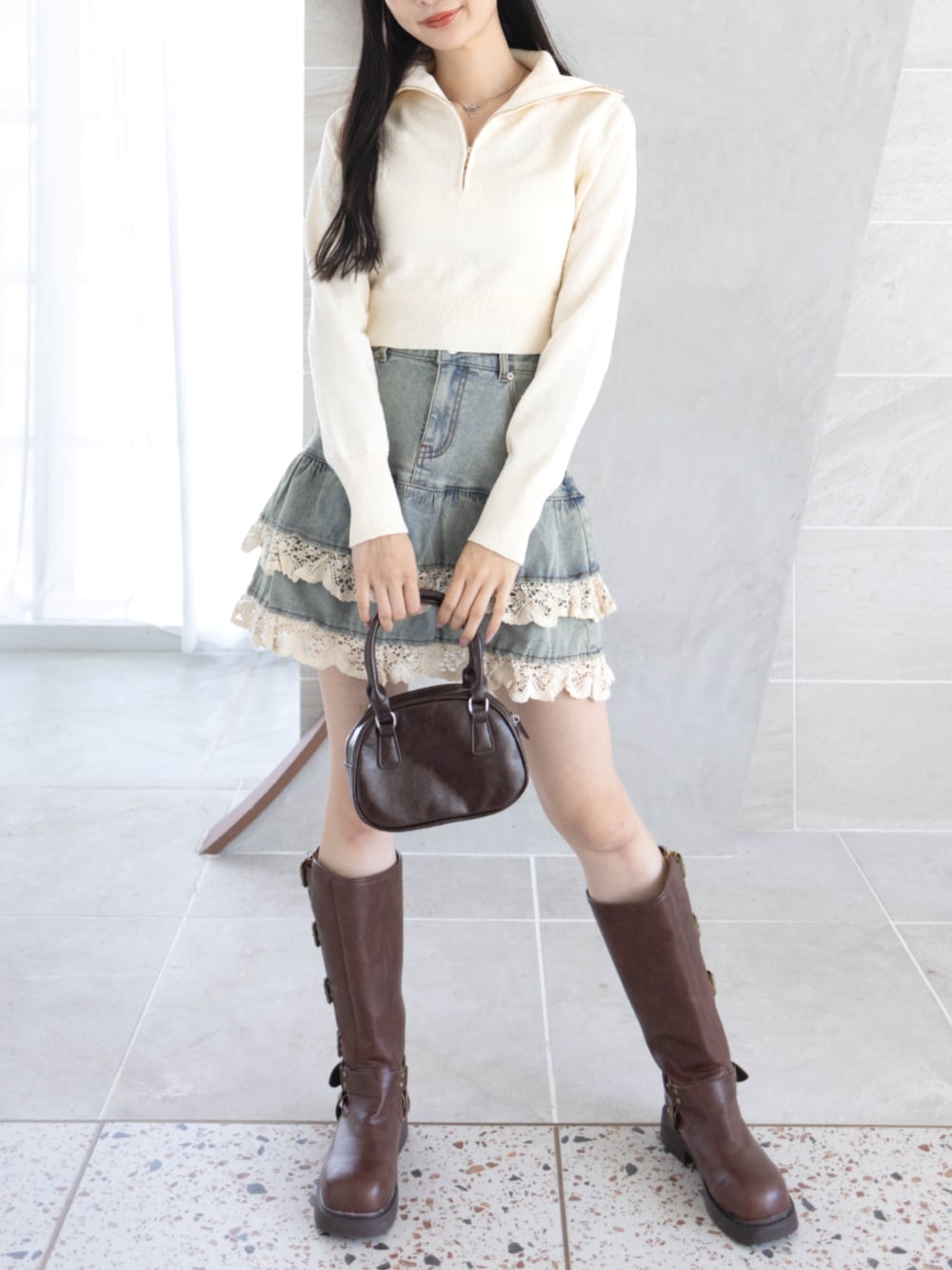 ハーフジップニットにデニム×レースのティアードスカートを合わせて カジュアルさの中にガーリーなエッセンスを効かせたスタイリングです。