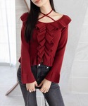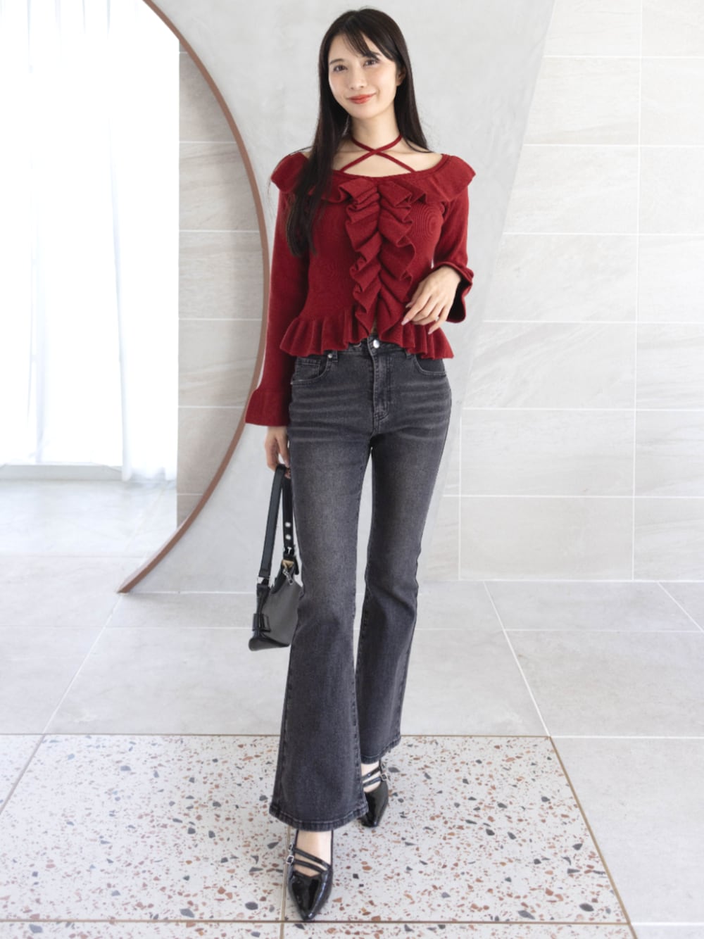 フリルが華やかな赤ニットにブラックデニムを合わせて 大人可愛いバランスにまとめました。