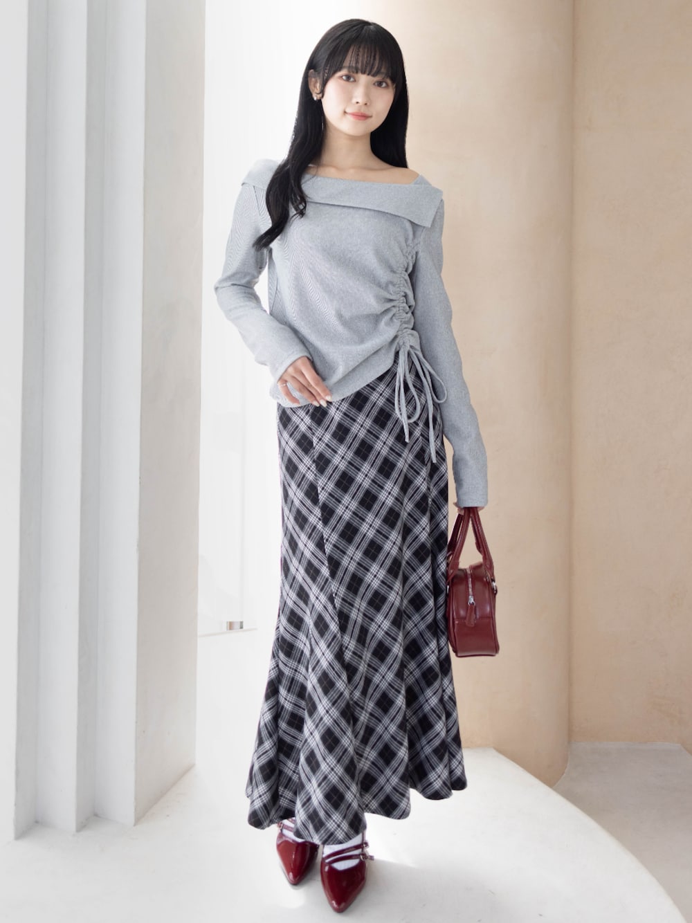 斜めのネックラインとサイドギャザーが上品で チェック柄スカートと合わせてクラシカルな雰囲気に仕上がっています。