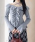 フリルとショルダーデザインが華やかなトップスに チェック柄スカートで甘さと上品さを兼ね備えたコーディネートです。