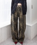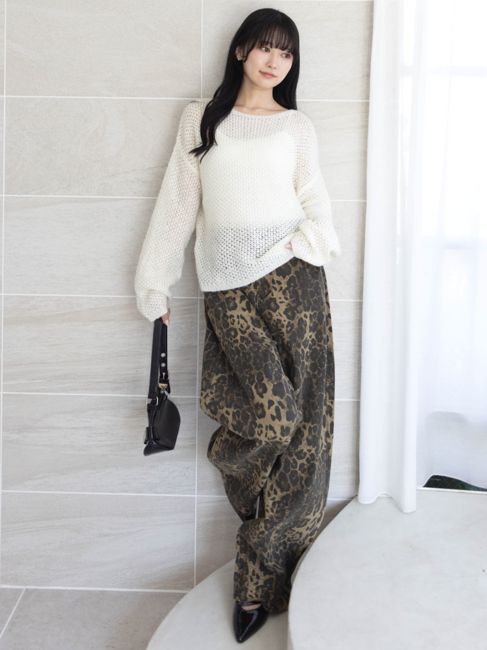ざっくり編みの白ニットにレオパード柄パンツを合わせ 抜け感のある辛口カジュアルに仕上げています。