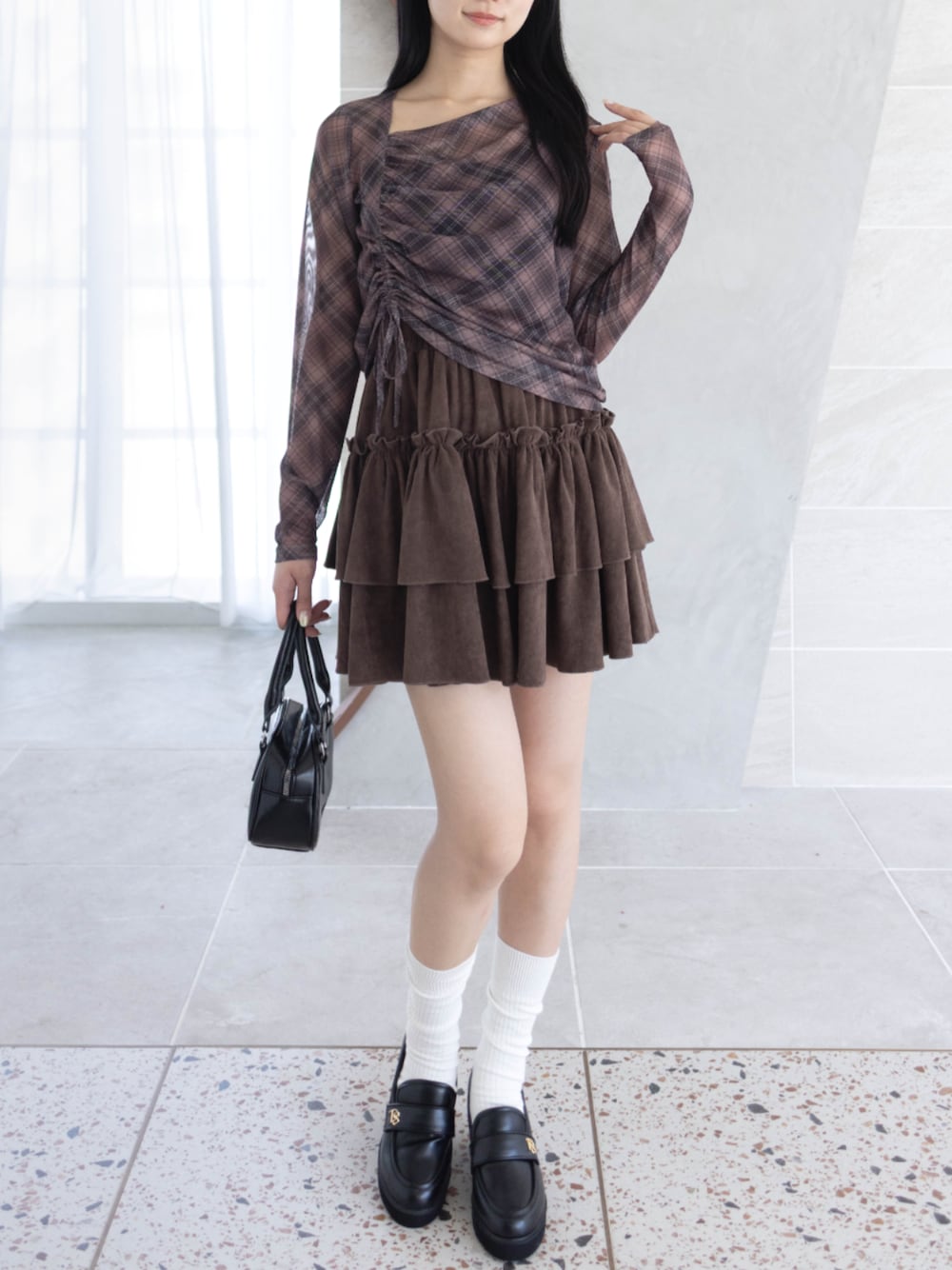 シアーなチェックトップスと ブラウンのティアードスカートの組み合わせが 秋らしい柔らかさと奥行きを演出してくれます♪
