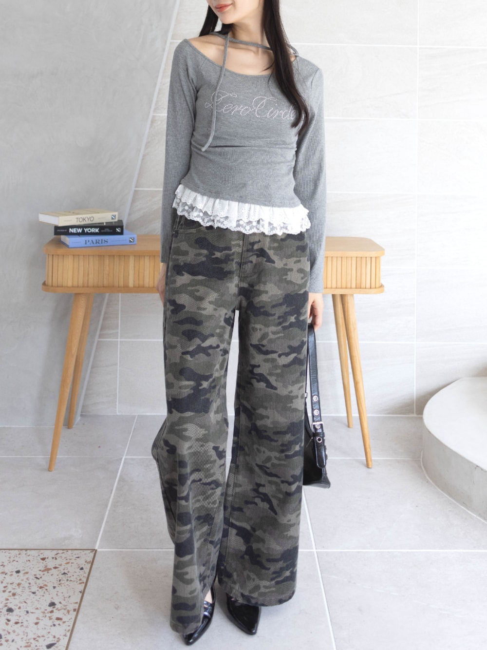 カモフラ柄にガーリーなトップスが絶妙にマッチ