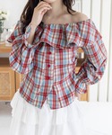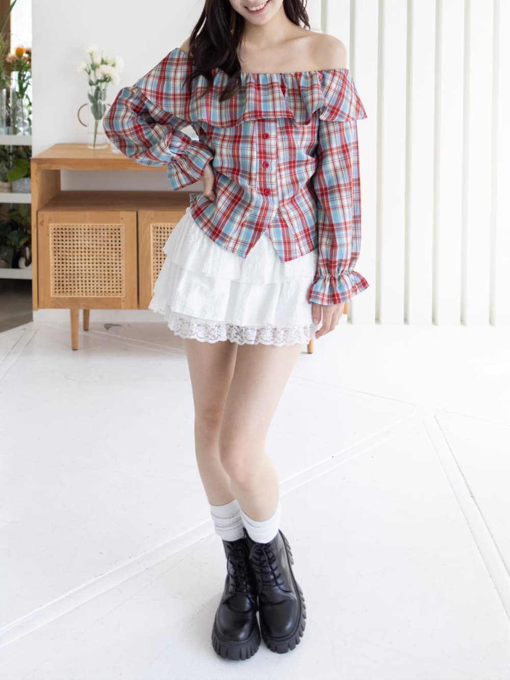オフショルのチェックブラウスが 甘さとレトロ感をプラスするガーリースタイル