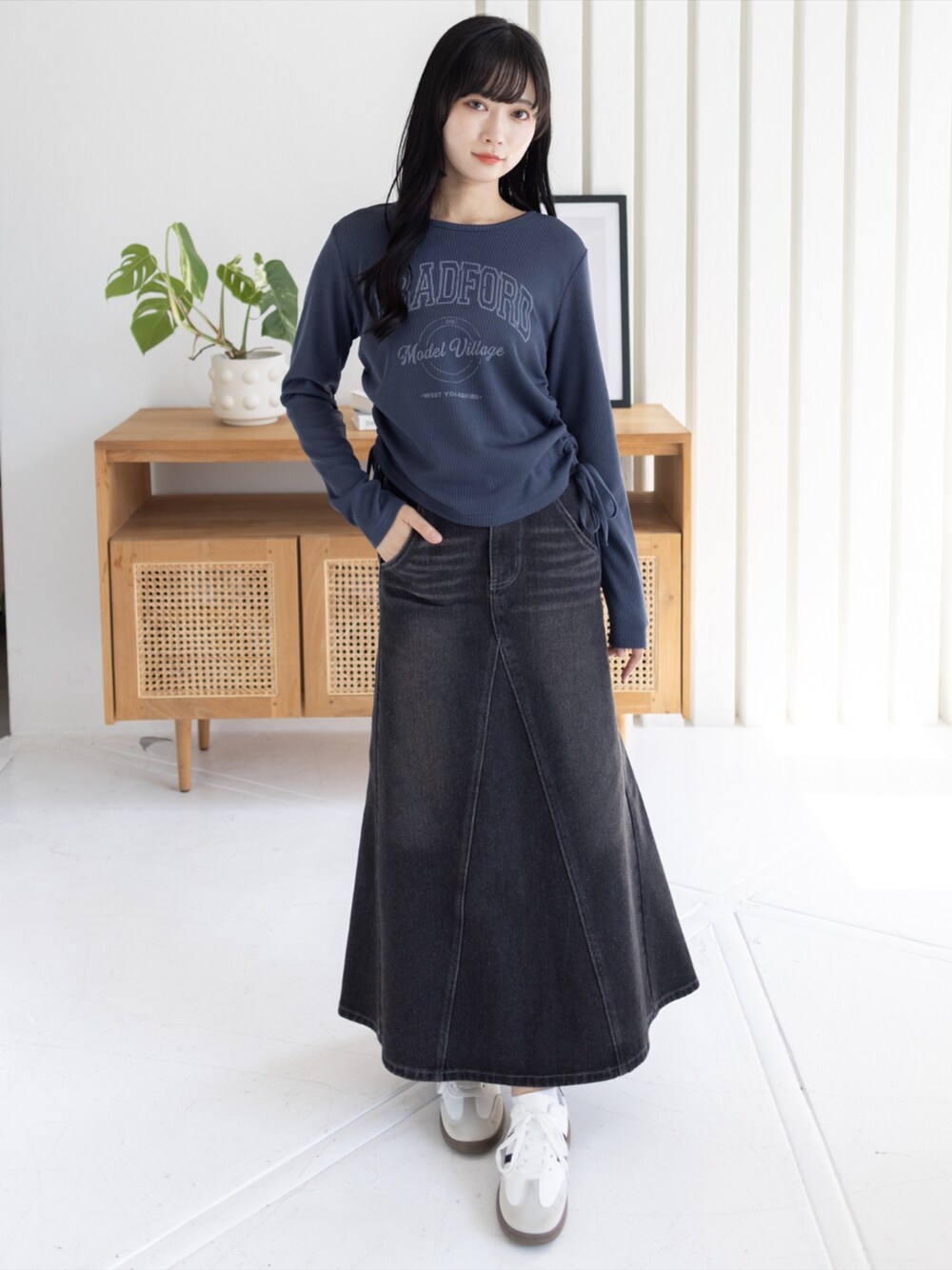 ロゴトップスとデニムロングスカートで大人カジュアルコーデ完成
