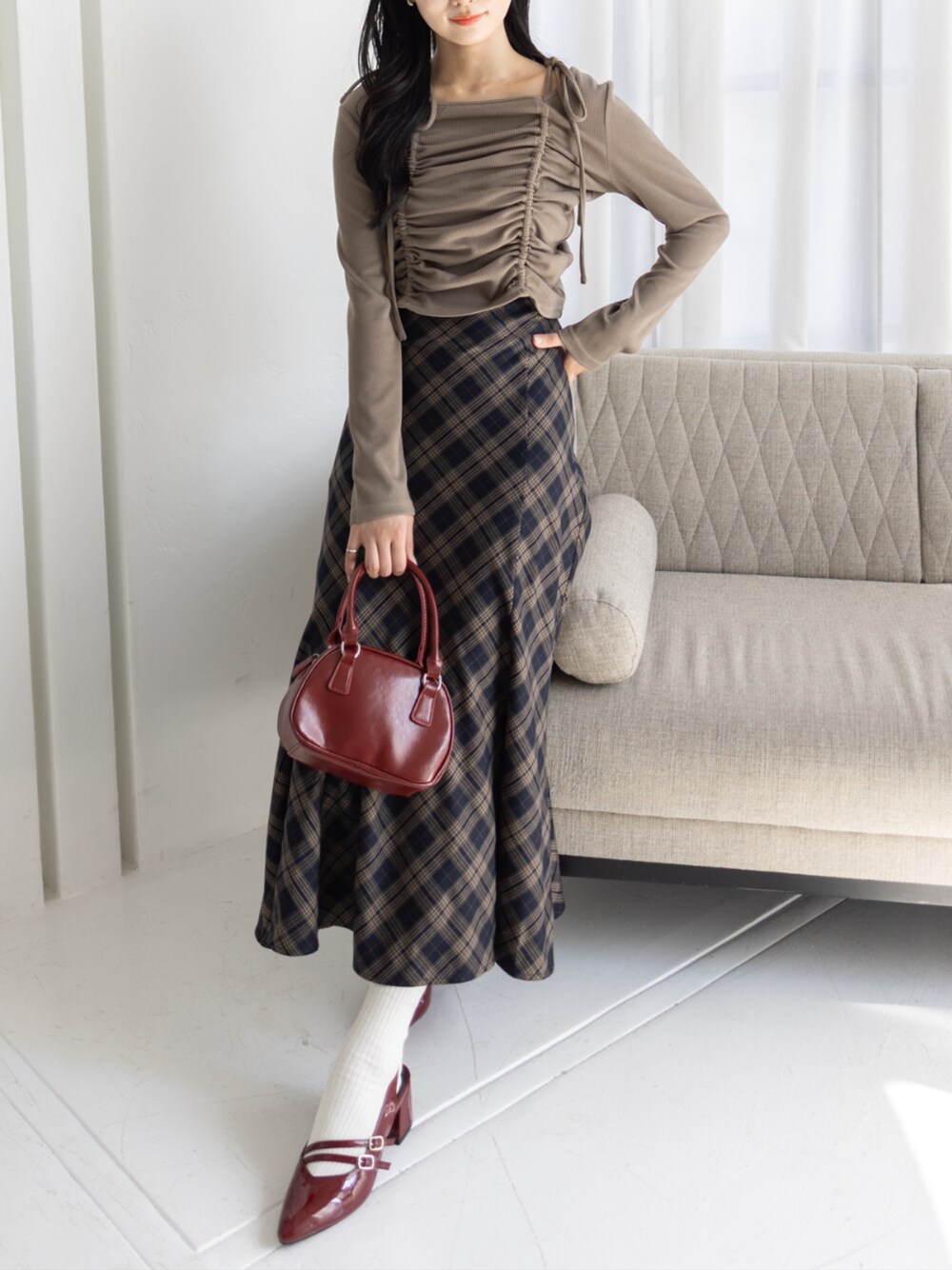 くしゅっとトップスとチェックスカートで大人ガーリーに♪