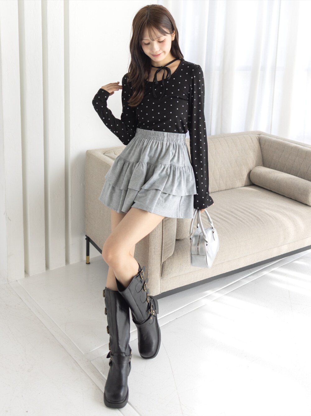 ドット柄トップスとフリルスカートで 甘さを出しつつ黒ブーツで引き締めたコーデ