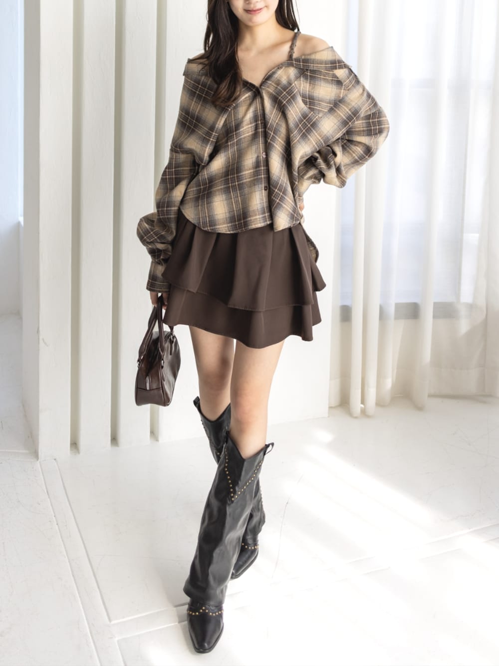 チェックシャツとフレアミニスカートの ワントーンコーデにロングブーツで甘さを引き締めた ガーリーミックススタイル
