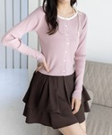 ピンクのリボンニットにフリルスカートを合わせた ガーリースタイル厚底シューズで甘さを引き締め