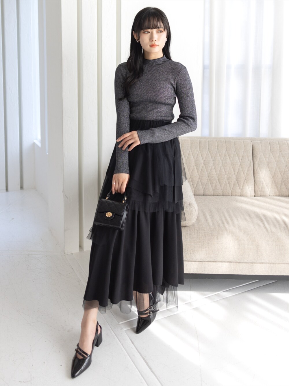 ラメトップスにチュールスカートを合わせた ワントーンコーデ異素材MIXで奥行きを演出