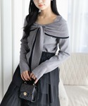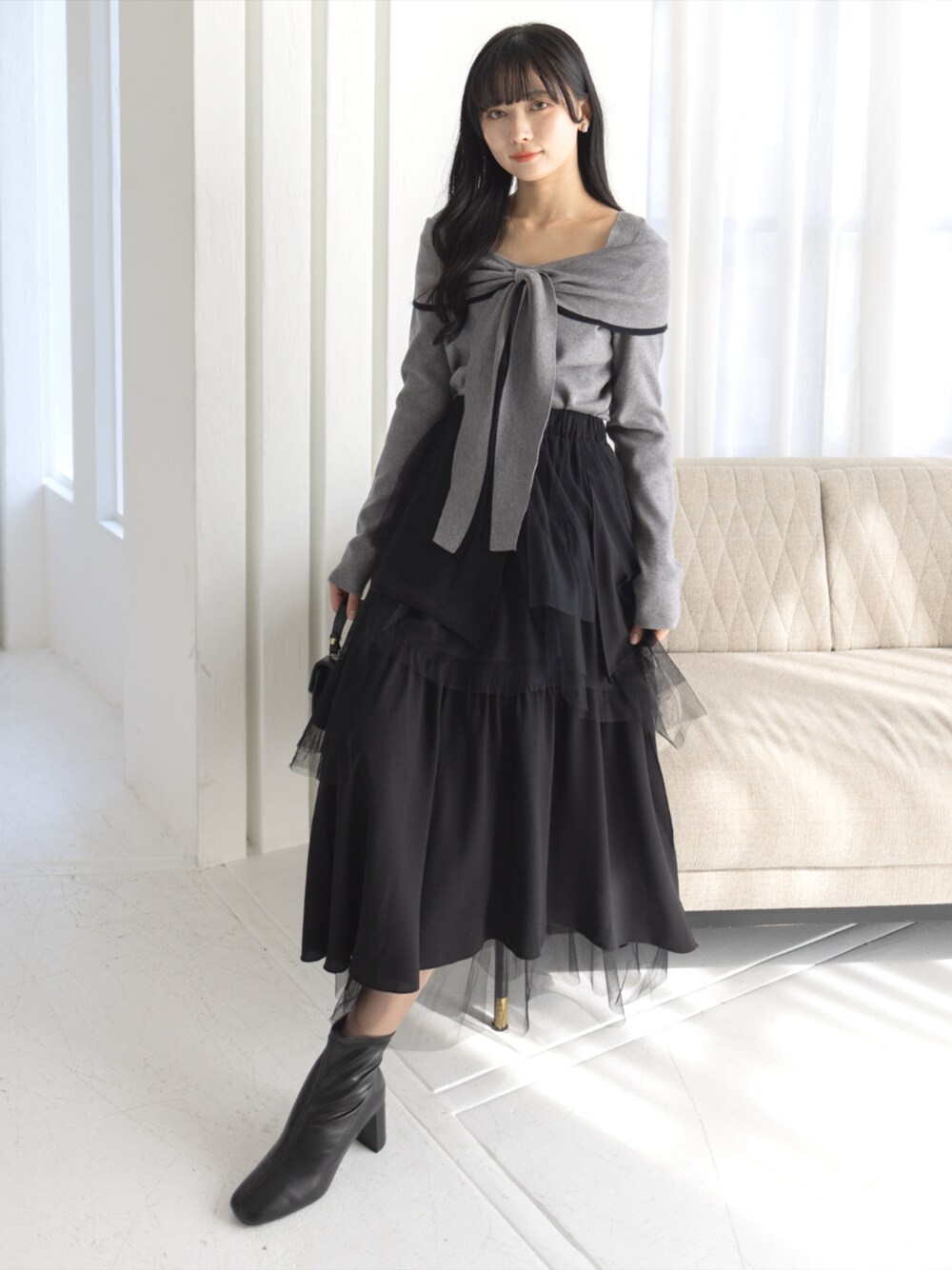 セーラーカラー風のリボントップスに チュールスカートを合わせた モノトーンコーデシックで大人っぽい雰囲気に♪