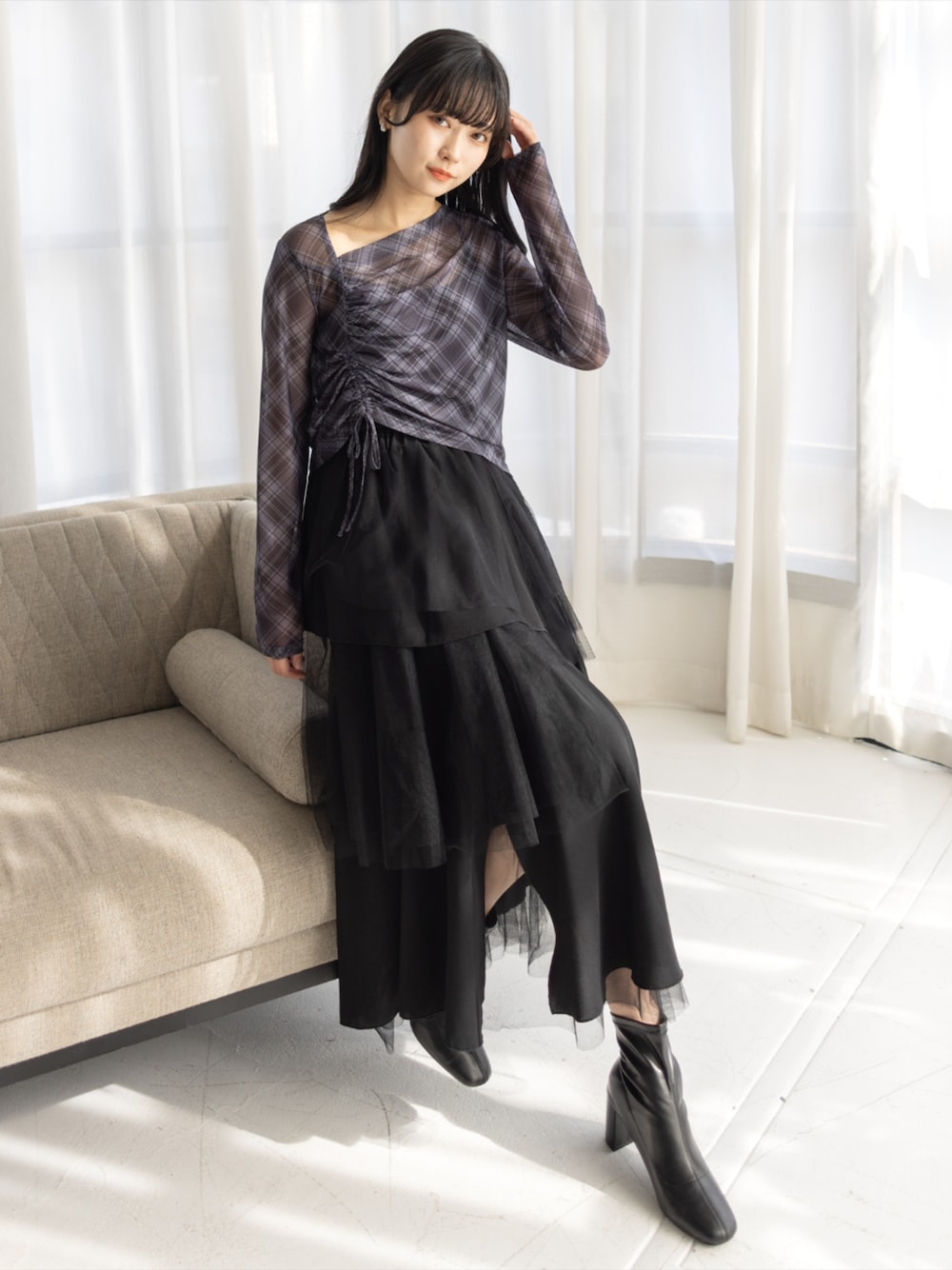 シアーチェックトップスとチュールレイヤードスカートの 異素材ミックスコーデ。 透け感と揺れ感が魅力の、シックで女性らしいスタイリング。
