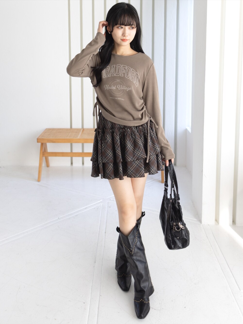 ロゴトップスとチェックフリルスカートで 大人カジュアルな甘辛ミックスコーデ
