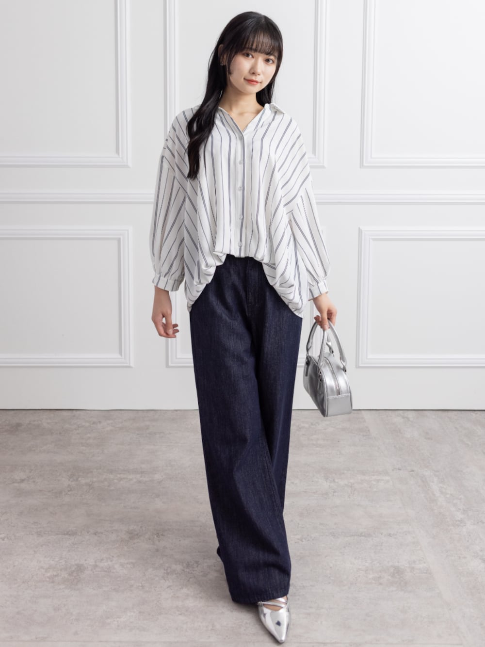 ストライプシャツとワイドデニムで リラックス感ある大人カジュアルコーデ