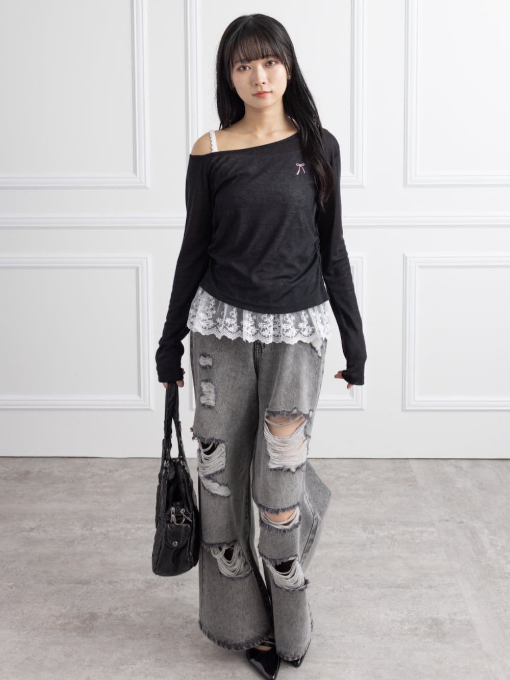 大胆クラッシュデニムで視線を惹く 甘辛MIXコーデ裾レースや肩見せでさりげなくガーリーさをプラス