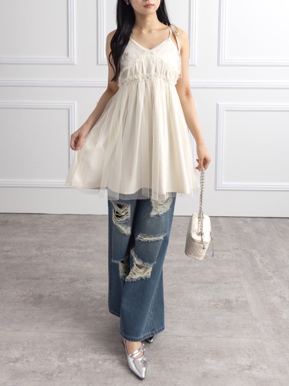 チュールキャミとダメージデニムでつくる甘辛バランスコーデ