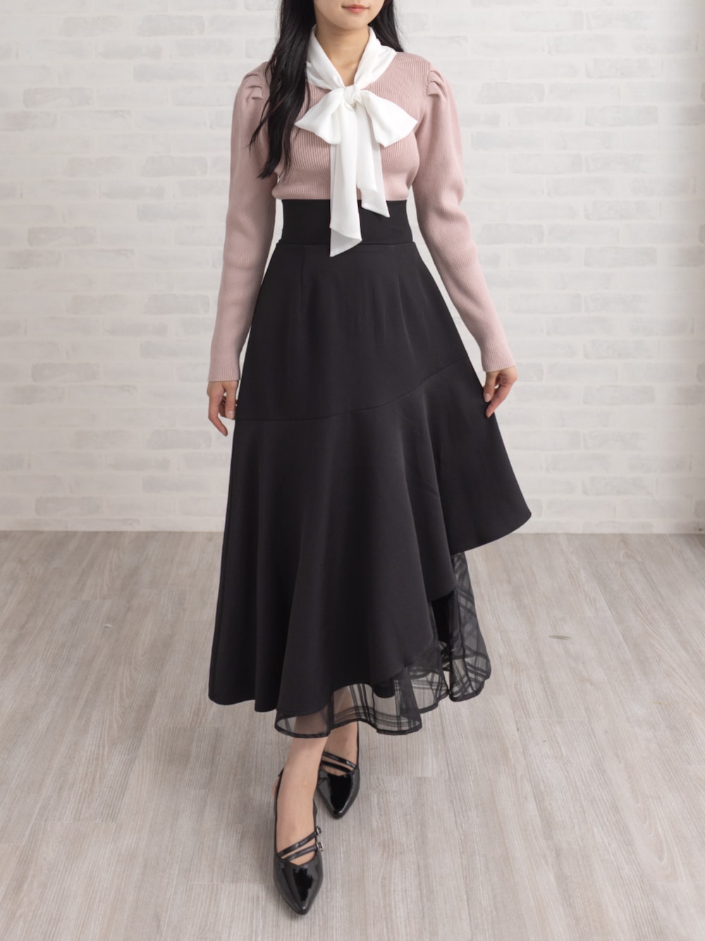 淡ピンクと黒のコントラストが効いた大人フェミニンコーデ