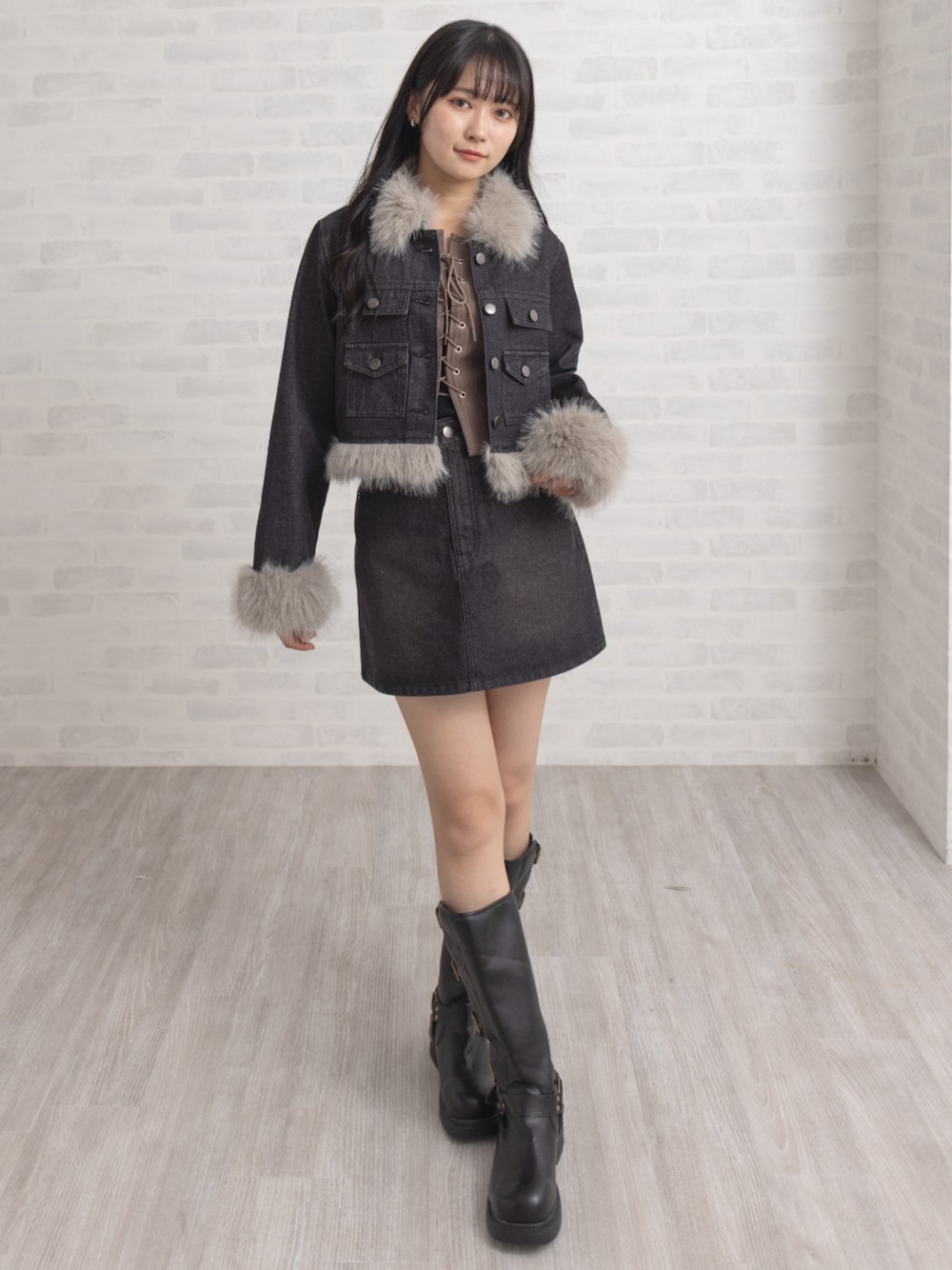 ファー付きデニムジャケットが主役の冬映えセットアップコーデ