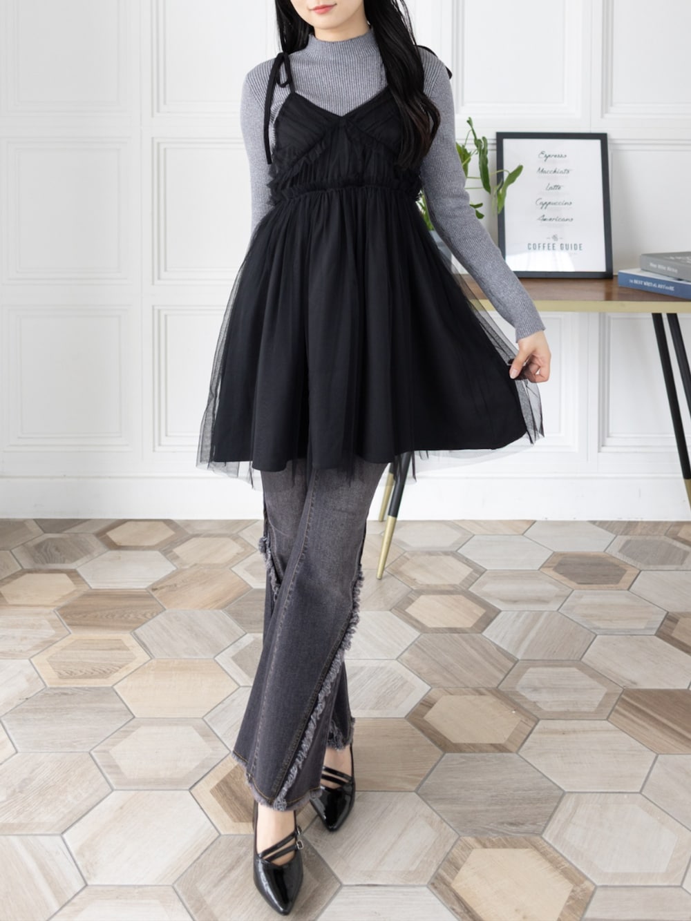 チュールキャミで甘さを添えたレイヤードパンツコーデです