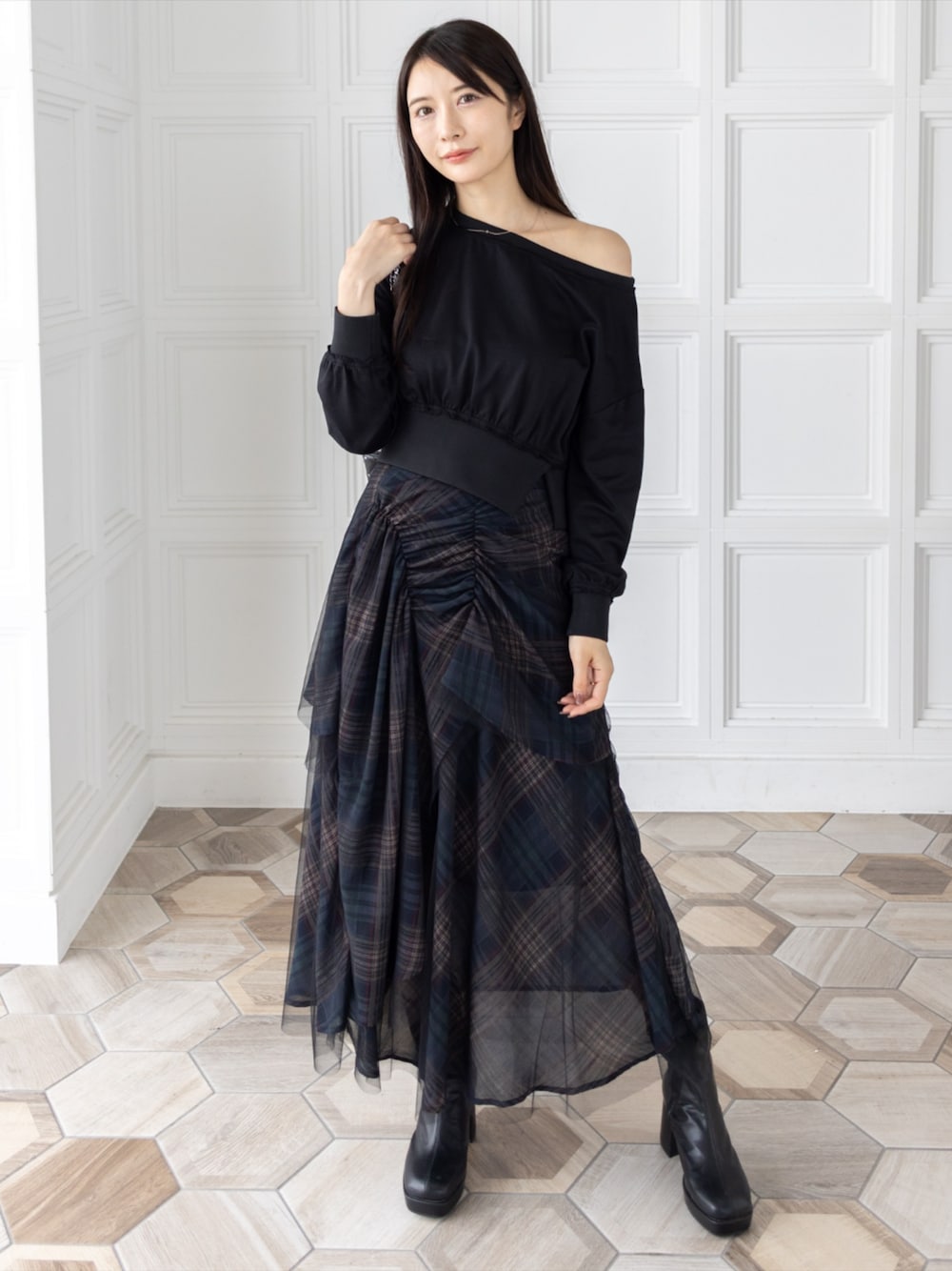 オフショル×チェックチュールが大人可愛いモードコーデ