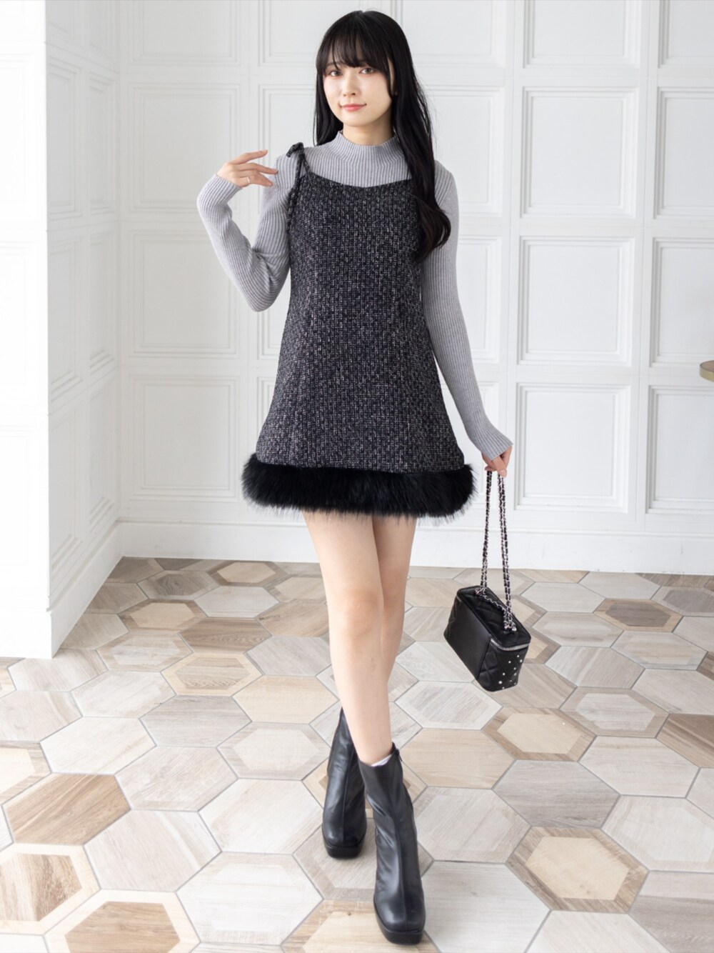 ツイード×ファーで大人ガーリーな冬ワンピコーデ