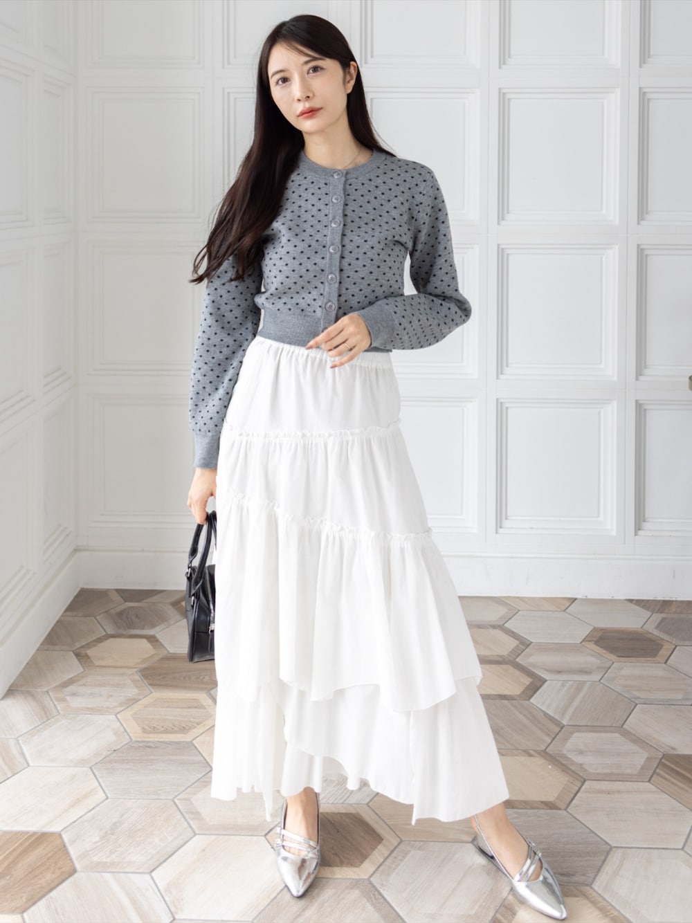 ドットカーデ×ティアードスカートで上品フェミニンコーデ