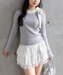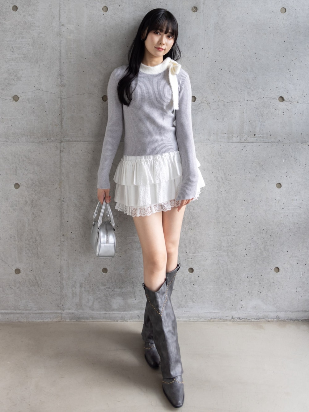 リボン付きニットにフリルスカートを合わせた ガーリーな甘辛ミックスコーデです