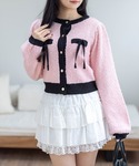 リボン付きピンクカーデと黒フレアスカートの 甘辛バランスが大人可愛い雰囲気です