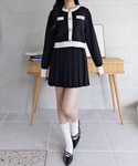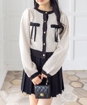 リボン付きカーディガンとプリーツスカートが 甘さと上品さを絶妙に両立しています
