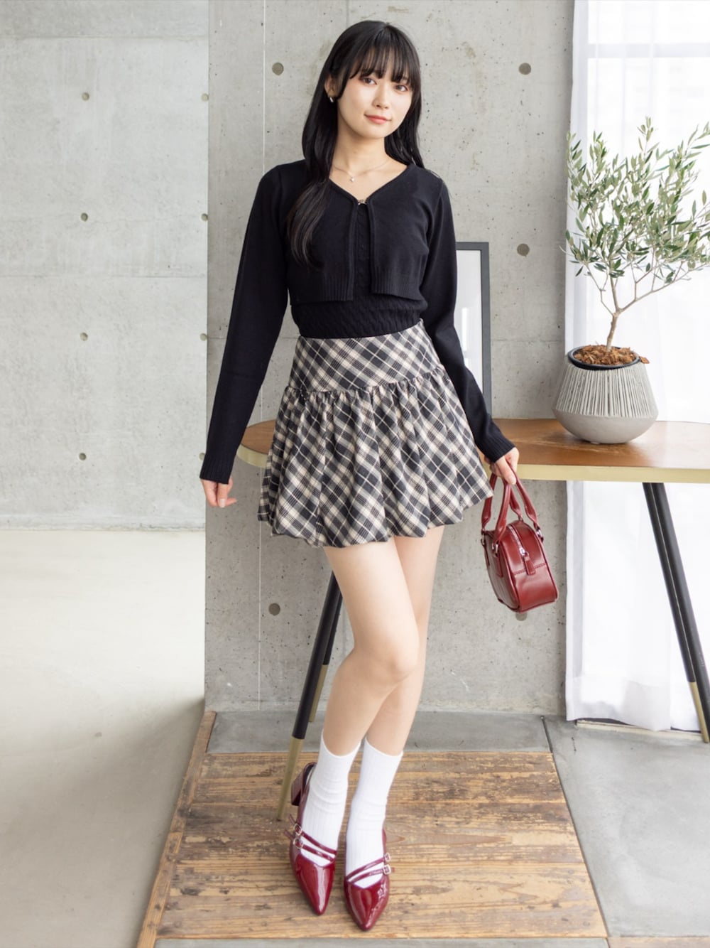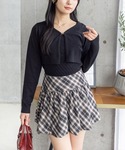ショート丈ニットとチェックフリルスカートの甘辛ミックスコーデ