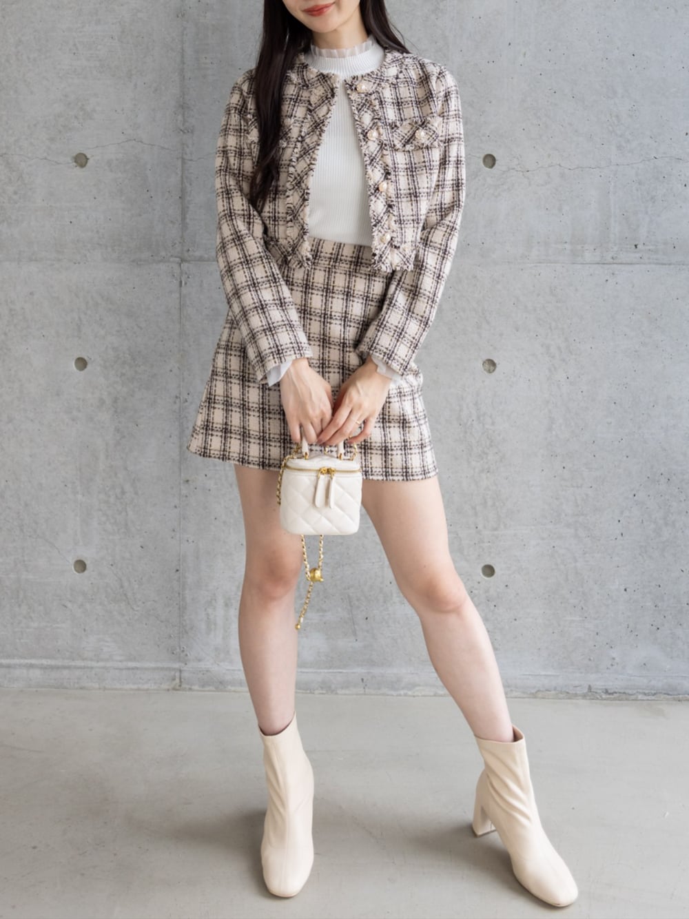 ツイードセットアップがエレガントで大人可愛いムードにぴったり