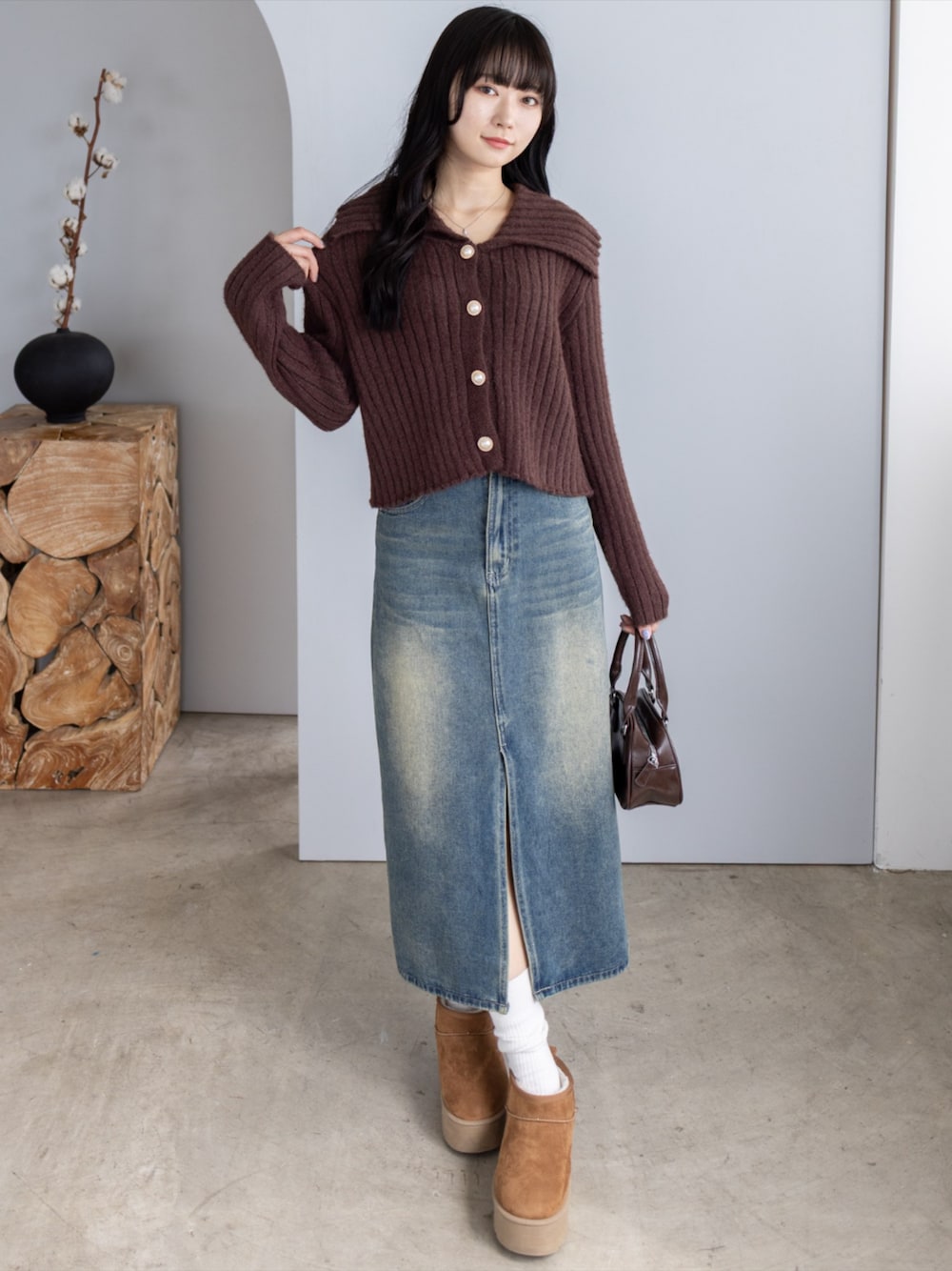 ブラウンのリブニットとデニムスカートのナチュラルコーデ