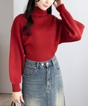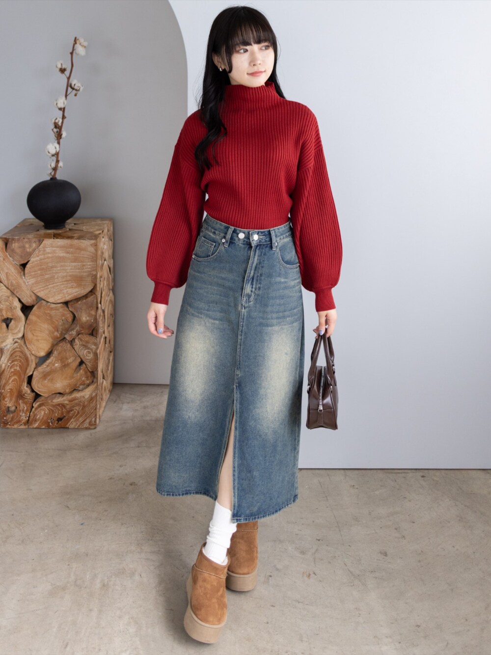 赤ニットとデニムスカートの大人カジュアルコーデ