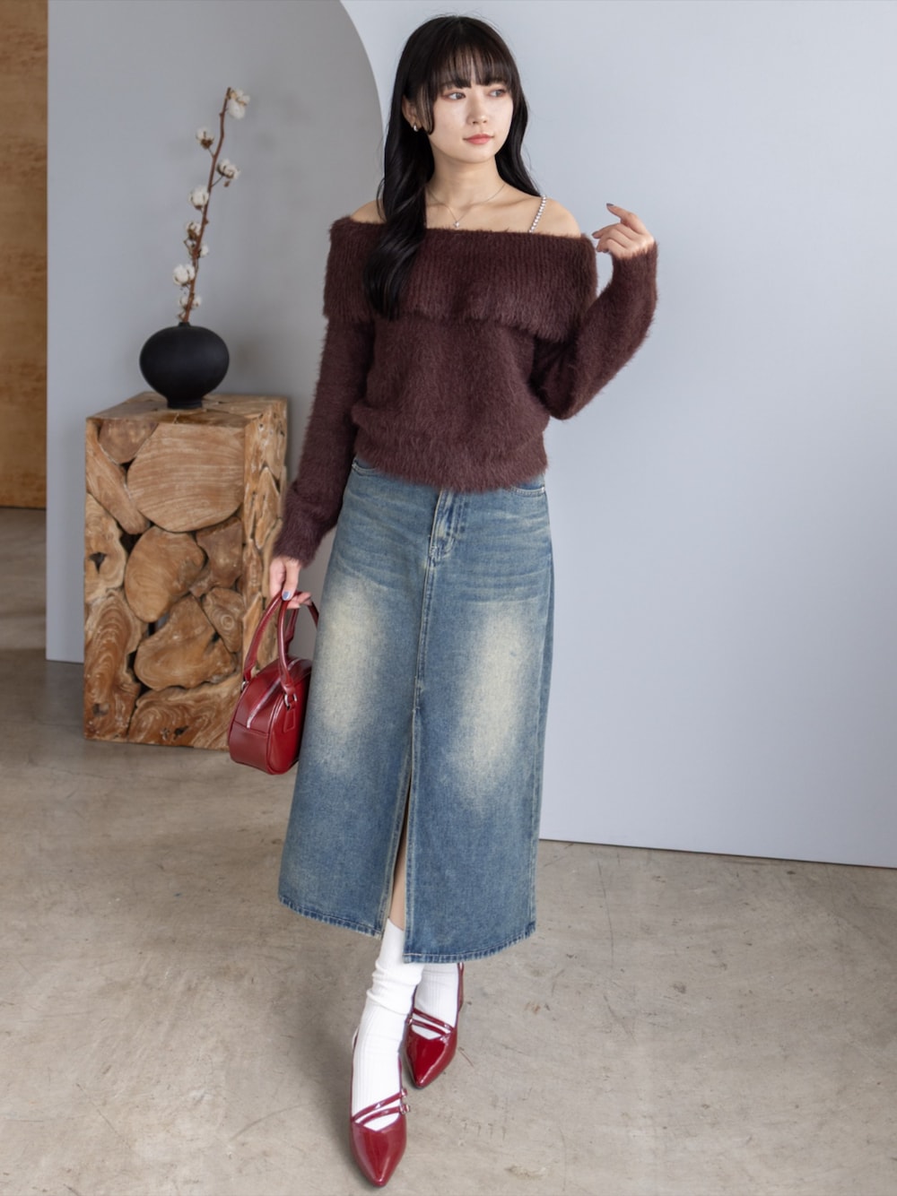 ボルドーニットとデニムスカートのフェミニンカジュアルコーデ