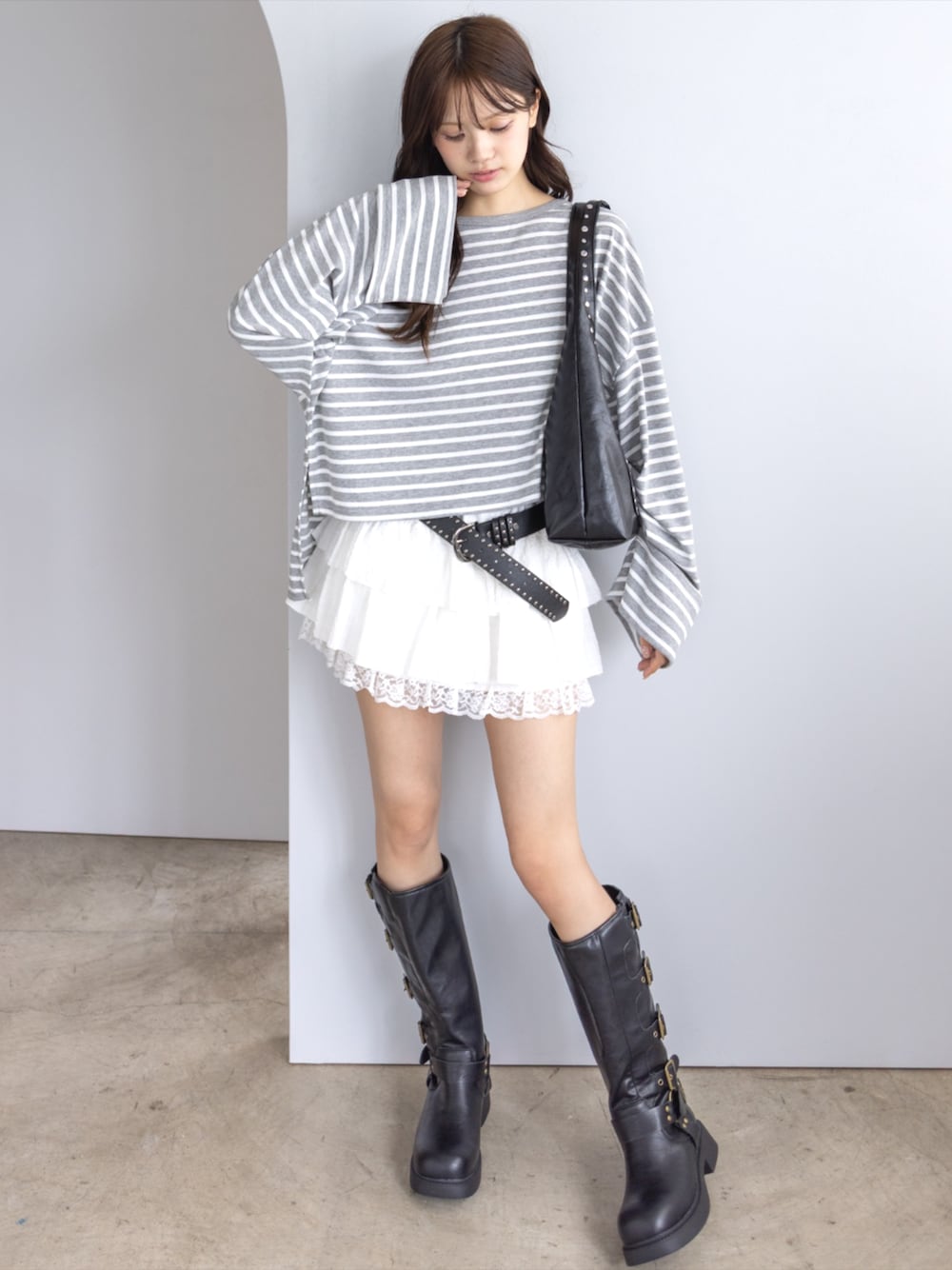 ボーダーニットと白フリルスカートのカジュアルガーリーコーデ