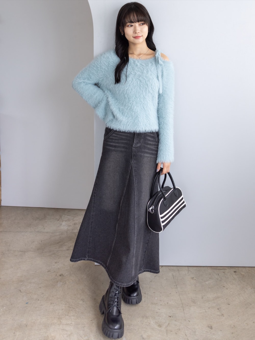 ブルーニットと黒デニムスカートの大人ガーリーカジュアルコーデ