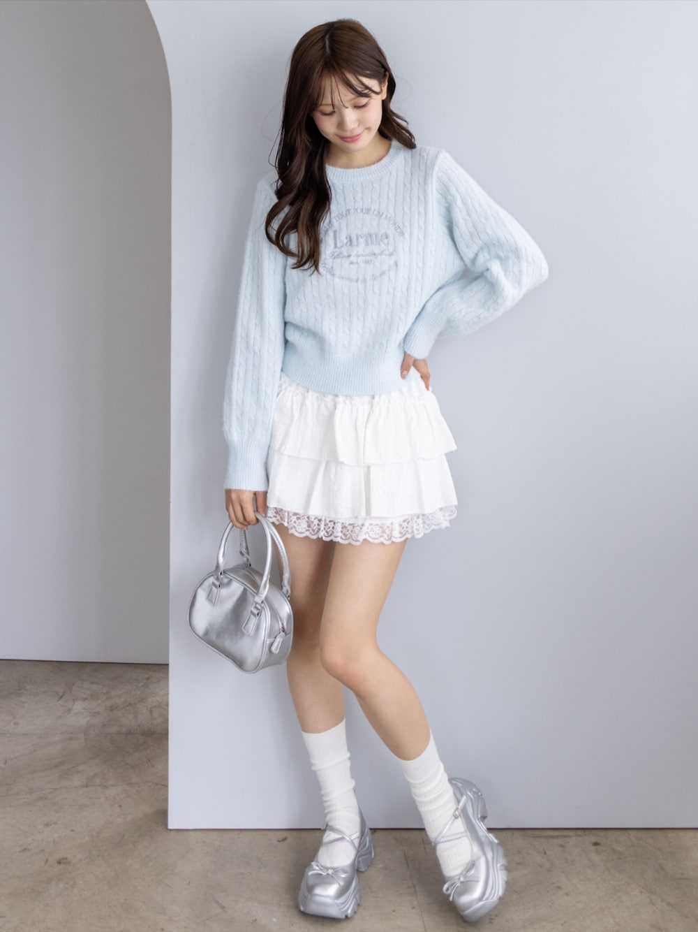 サックスブルーニットと白フリルスカートのガーリーコーデ