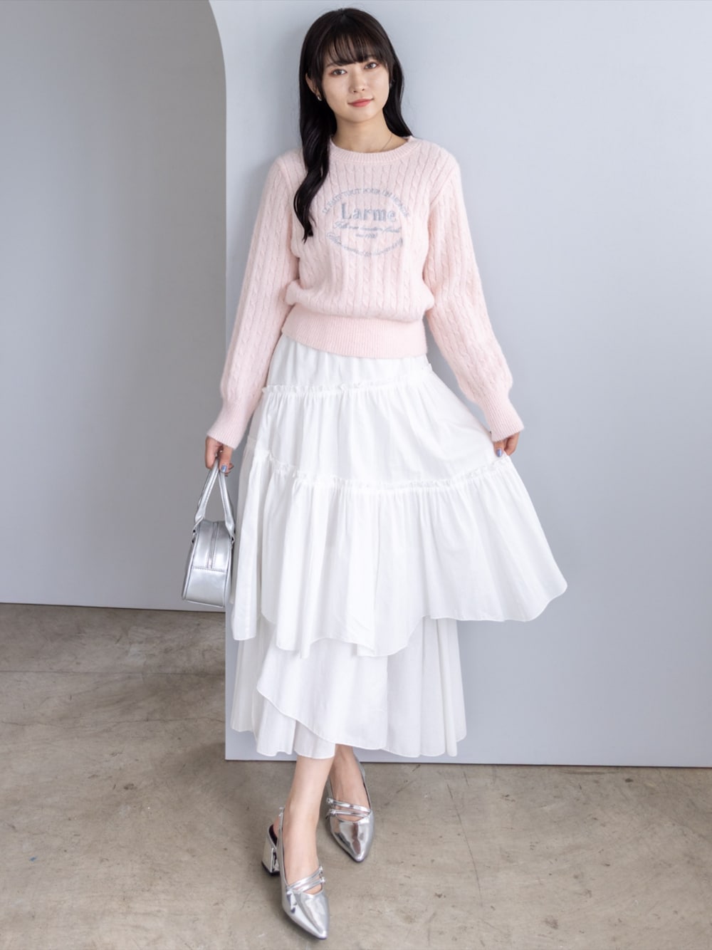 ピンクニットと白ティアードスカートのガーリーフェミニンコーデ