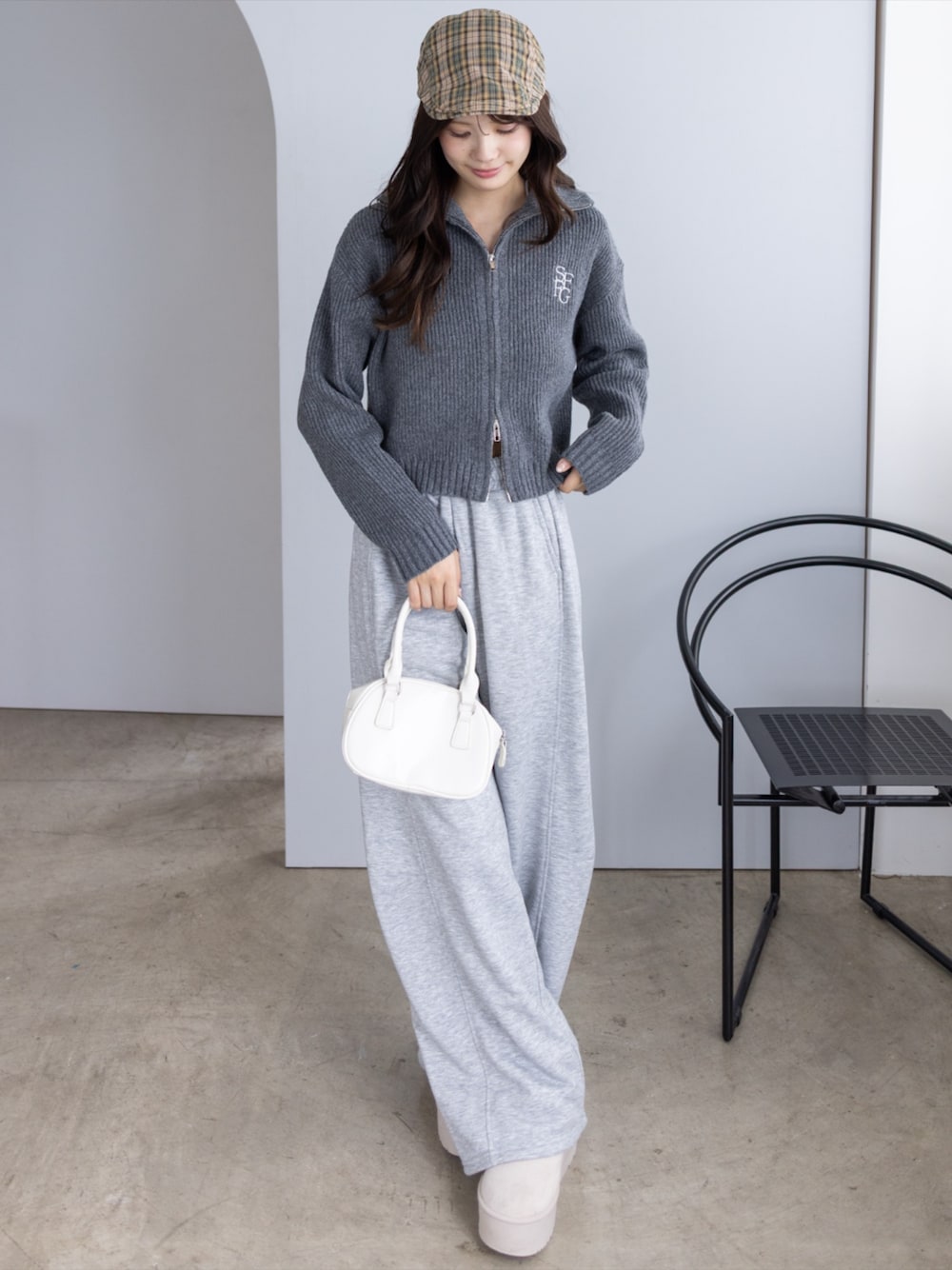 グレージップニットとスウェットパンツの カジュアルリラックスコーデ