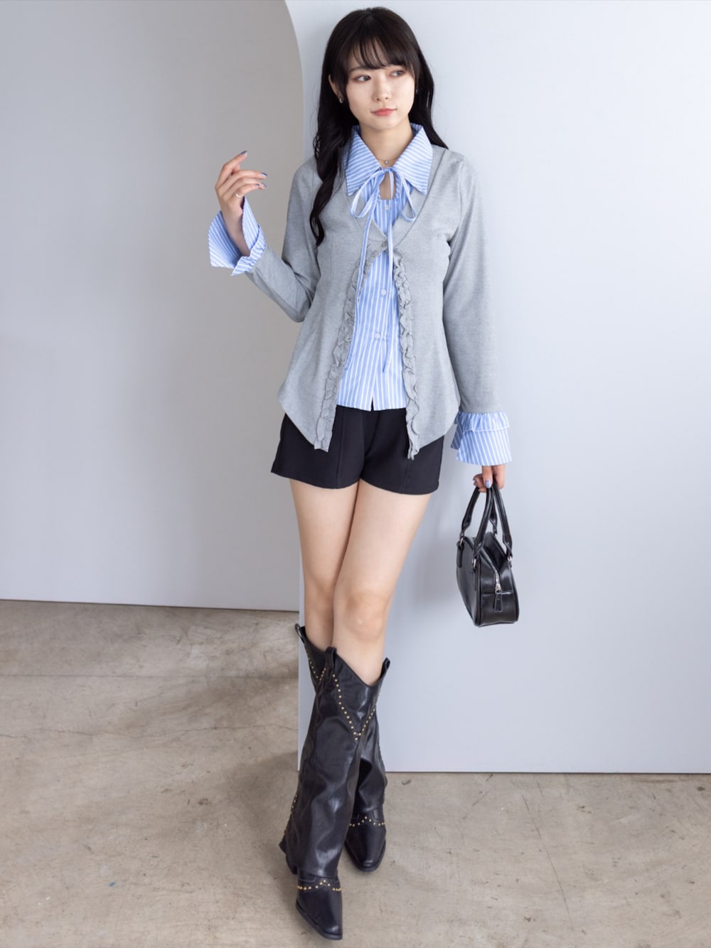 ブルーのストライプシャツにグレーのフリルカーディガンを重ね ブラックショートパンツとロングブーツでまとめた 大人ガーリーコーデ