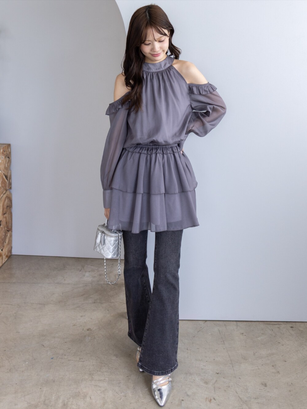グレーのオフショルブラウスにフレアデニムを合わせた 上品カジュアルコーデ